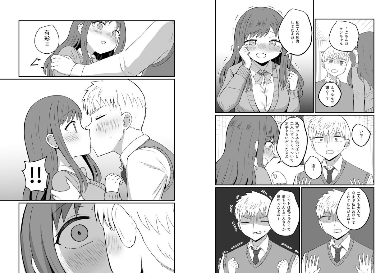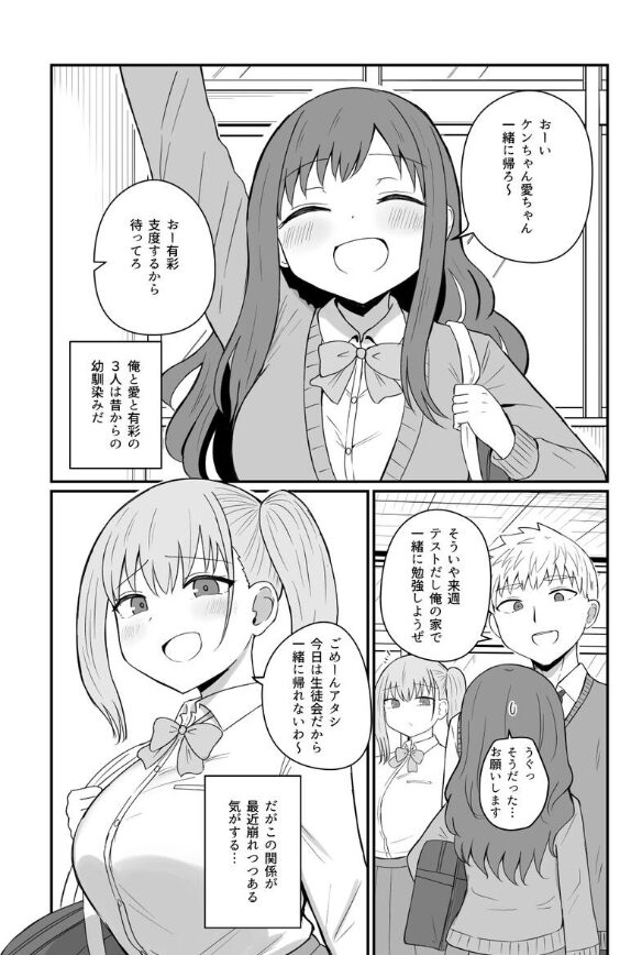 健太郎、有彩、愛はいつも仲良し3人組の幼馴染。健太郎ふとしたきっかけで二人とセックスをしてしまう。有彩のことが好きだったはずの健太郎は愛のことも気になるようになってしまい、ある提案を二人にする…。